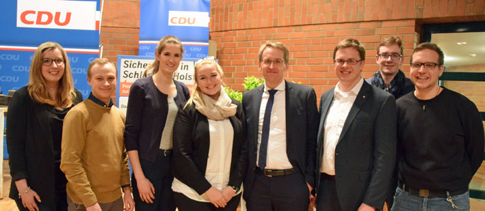 Diskutierten mit 70 CDU Mitgliedern über das CDU-Landtagswahlprogramm: Der Europaabgeordnete Reimer Böge, der Kreisvorsitzende der Jungen Union und Landtagskandidat Ole-Christopher Plambeck, der CDU-Landesvorsitzende und designierte Spitzenkandidat Daniel Günther, die Landtagsabgeordnete und Landesvorsitzende der Frauen Union Katja Rathje-Hoffmann , der CDU Kreisvorsitzende und Bundestagsabgeordnete Gero Storjohann und der Landtagsabgeordnete und stellvertretende CDU Kreisvorsitzende Dr. Axel Bernstein