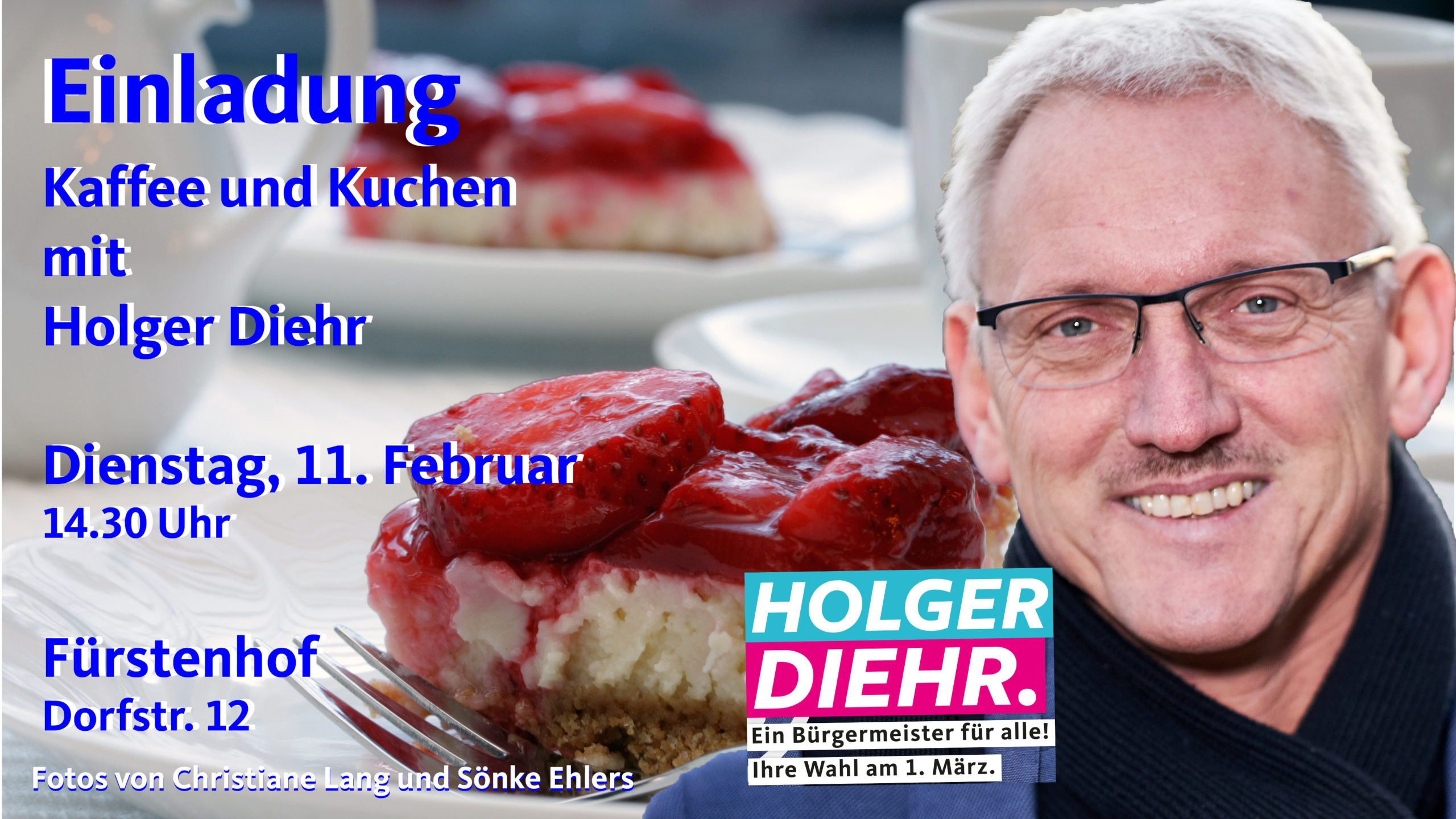 am 11.02.2020 von 14:30 Uhr bis 16:30 Uhr lädt der Bürgermeisterkandidat Holger Diehr Sie herzlich in den Fürstenhof, Dorfstraße 12, 24558 Henstedt-Ulzburg auf ein Stück Kuchen undeine Tasse Kaffee oder Tee ein.