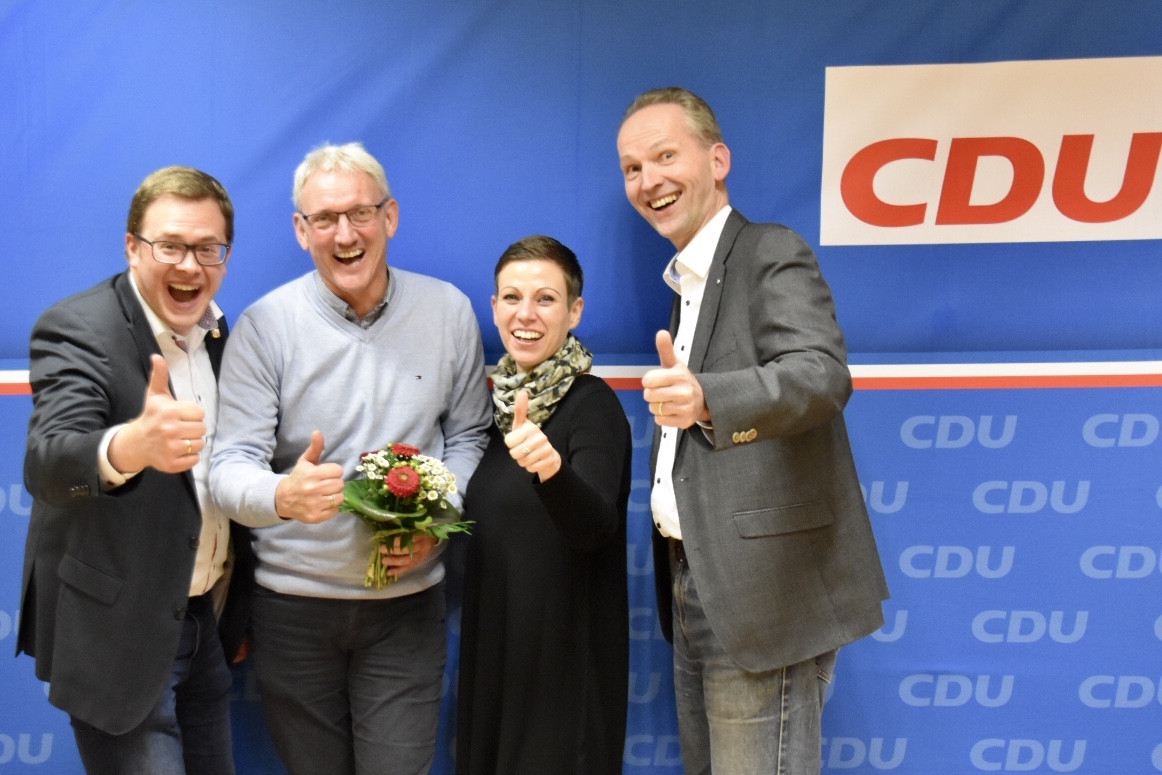 (Vlnr.) Wahlleiter Ole-Christopher Plambeck MdL, Bürgermeisterkandidat Holger Diehr, 2. Stellvertretende CDU Ortsvorsitzende Claudia Meyer und der CDU Fraktionsvorsitzende Dr. Dietmar Kahle.